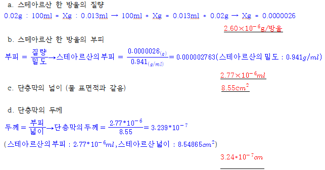 2) 스테아르산 용액 한 방울이 덮는 표면적